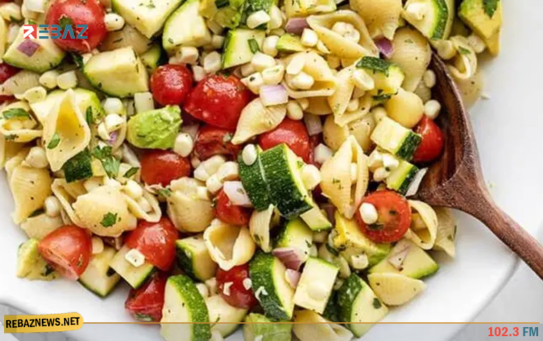 الخضار الصيفية الملونة ، الأفوكادو الكريمي ، المعكرونة ، صلصة الخل بالليمون تجعل هذه السلطة الخفيفة والصيفية حلوة وطازجة.