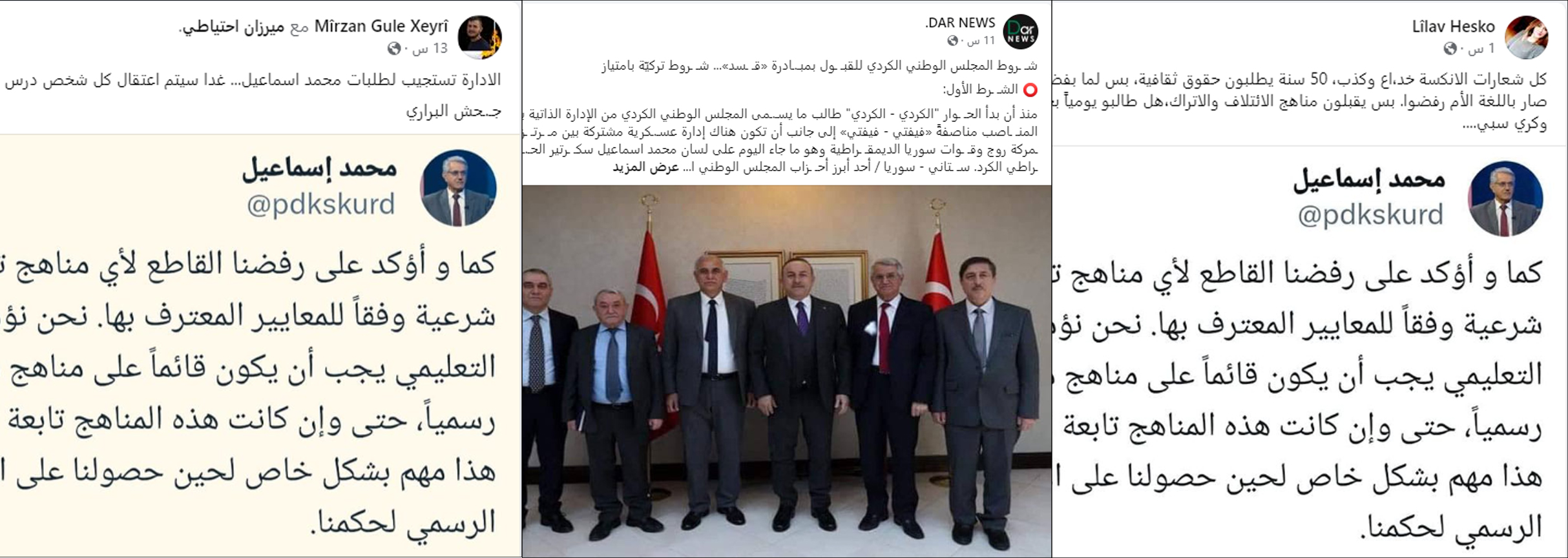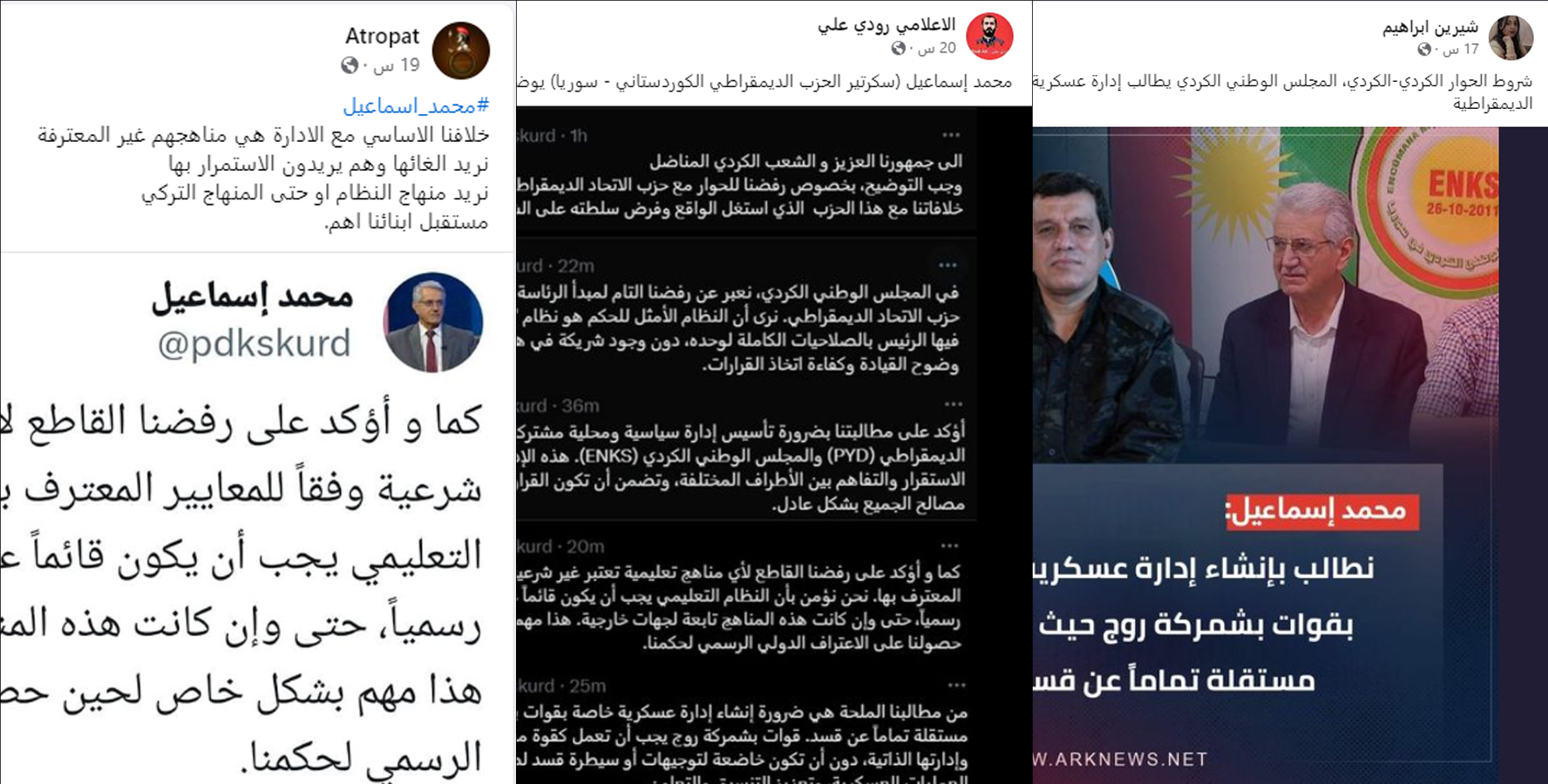 وتداولت صفحات محسوبة على حزب العمال الكوردستاني وأشخاص يدّعون مزاولة مهنة الإعلام تصريحات منسوبة لعضو هيئة رئاسة ENKS وسكرتير الحزب الديمقراطي الكوردستاني - سوريا، محمد إسماعيل، حول الموقف من استئناف المفاوضات الكوردية الكوردية.