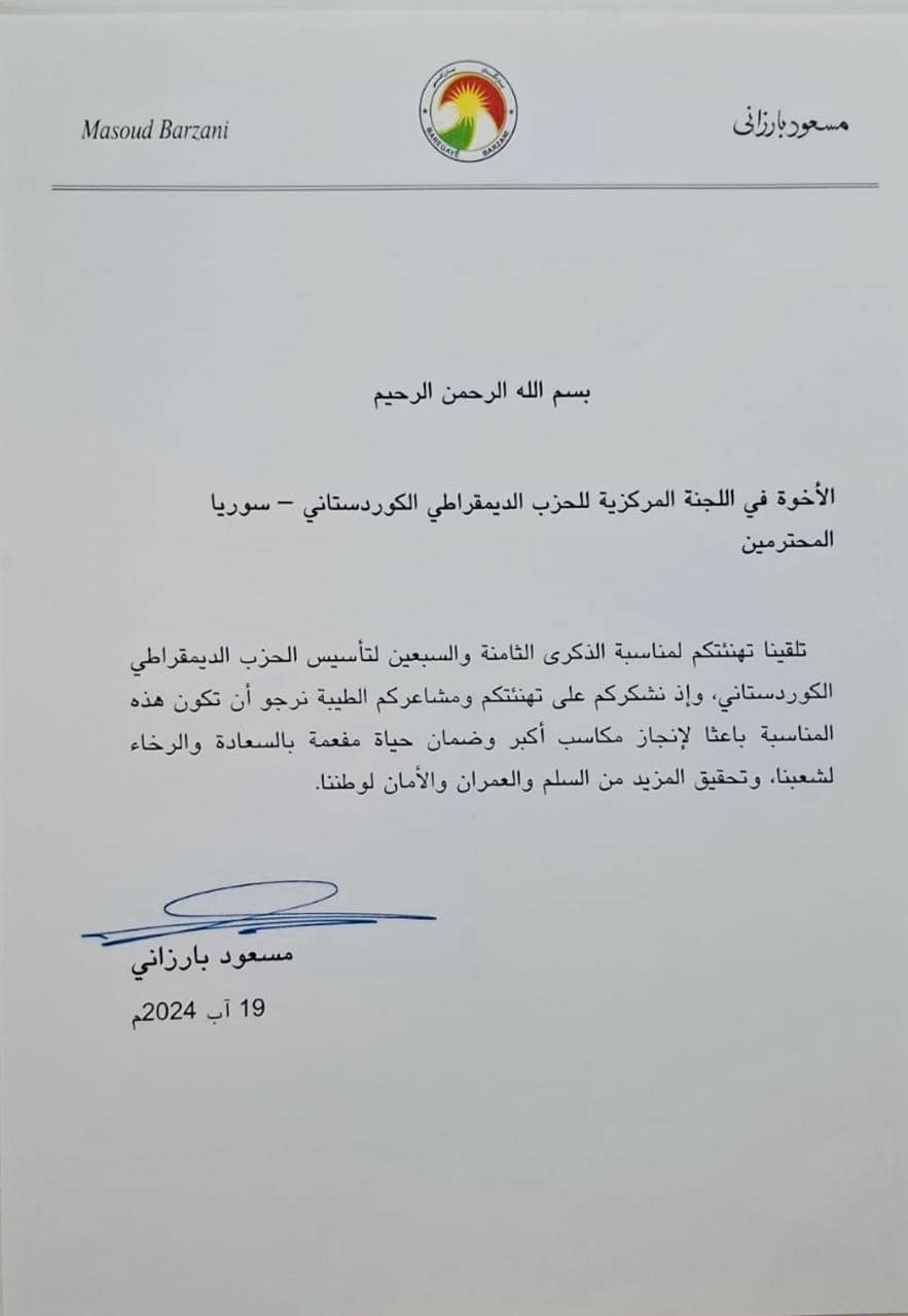 في رسالة جوابية، شكر الرئيس مسعود بارزاني الحزب الديمقراطي الكوردستاني - سوريا (PDK-S) على برقية التهنئة بمناسبة الذكرى الثامنة والسبعين لتأسيس الحزب الديمقراطي الكوردستاني (PDK).