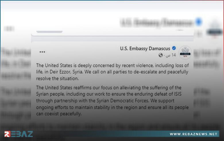 نشرت السفارة الأميركية في دمشق، على منصة "إكس": أن الولايات المتحدة "تشعر بالقلق العميق إزاء أعمال العنف الأخيرة" في دير الزور في سوريا، مع دعوة جميع الأطراف إلى وقف التصعيد.